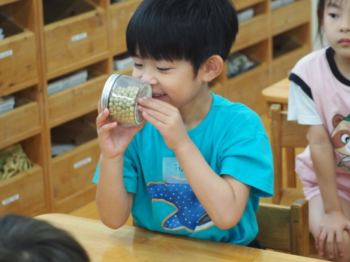 枝豆は大豆の仲間であることを話し、実際に乾燥大豆を見てもらうと、すぐに枝豆と大豆の違いに気付き、「枝豆と形が違う、枝豆より小さい」と、答えてくれました。