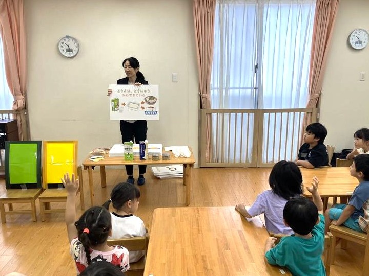 「豆乳を知っていますか?飲んだことがありますか?」という質問に、手を挙げた園児はわずか数名で、この移動教室が同保育園のほとんどの園児にとって、豆乳のことを知る初めての機会となり、興味を持って話を聞いていました。