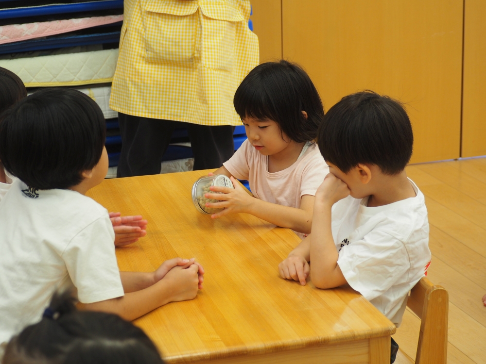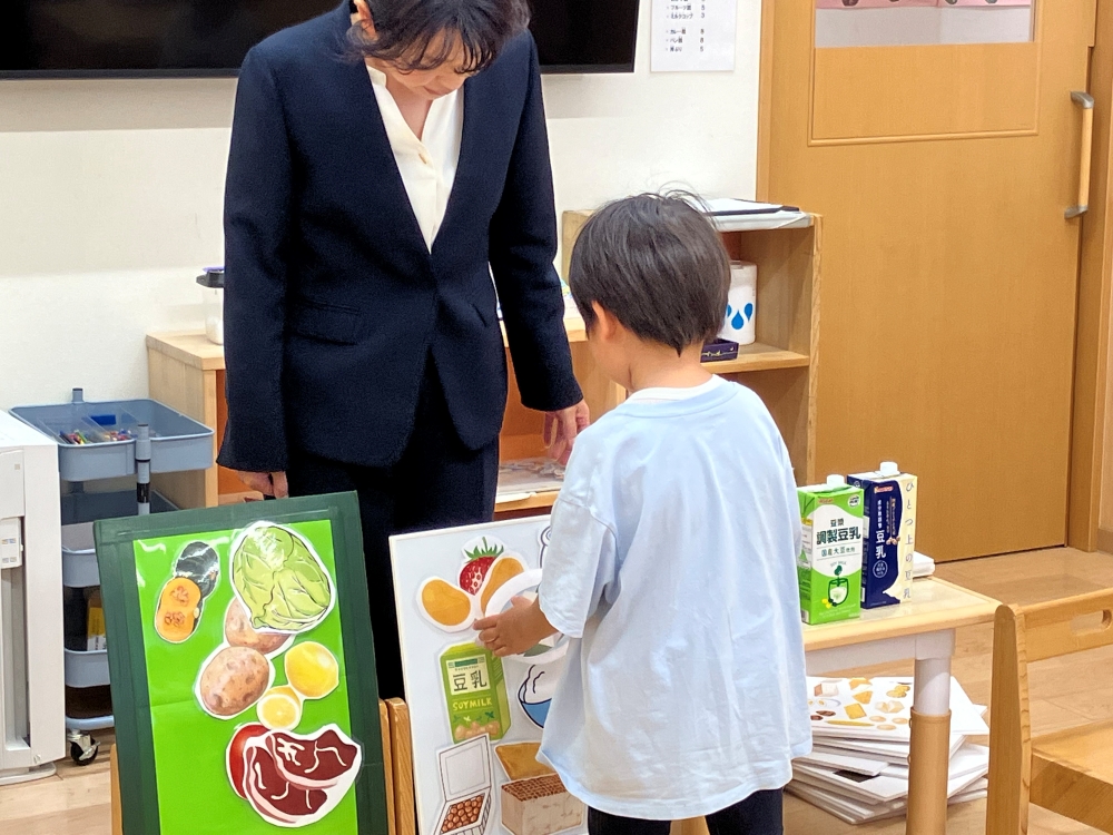 ボードを使った食べ物を分けるゲームは毎回園児の皆さんに人気のコーナーです。大豆製品の話は理解されたようで、大豆製品は迷いなく選択し、全問正解となりました!