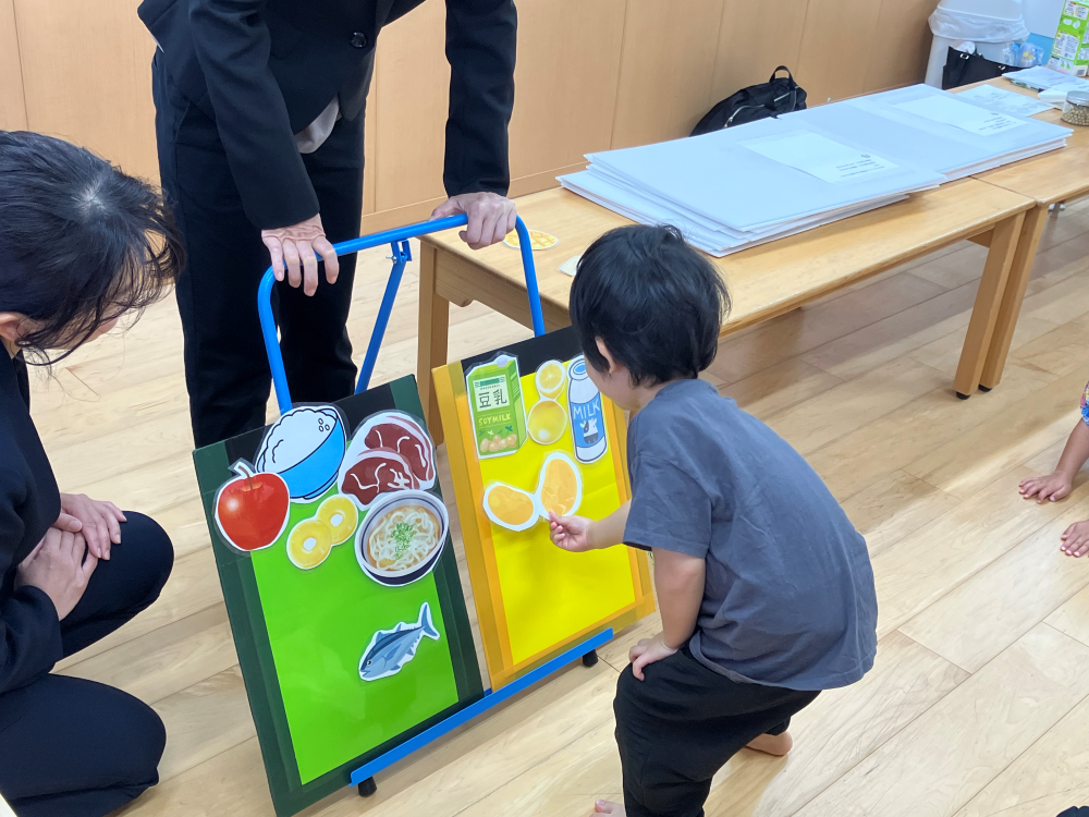 大豆から豆乳、そして豆乳から豆腐や厚揚げなど様々な大豆製品ができることを説明し、園児の皆さんには、豆乳と大豆製品の仲間グループ、それ以外の食品グループに分けて食べ物をパネルに貼るゲームを楽しんでもらいました。