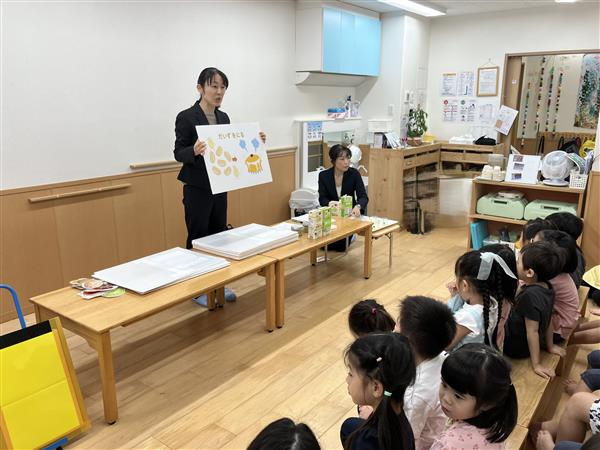 園のこどもたちが作ったお月見団子の絵画や、柿や葡萄の展示など、園内はすっかり秋めいた装飾の保育園でした。今回は年長児にあたる「たいよう組」8名、年中児にあたる「そら組」11名の園児の皆さんが出席しました。