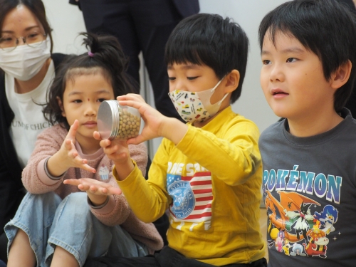 大豆もやしや枝豆が大豆の仲間であることを話すると、「姿形が全然違う!」と不思議そうな表情を見せ、興味津々の様子でした。豆乳の作り方を説明すると「おうちで作ってみる!」と目を輝かせながら答えてくれる子もいました。
