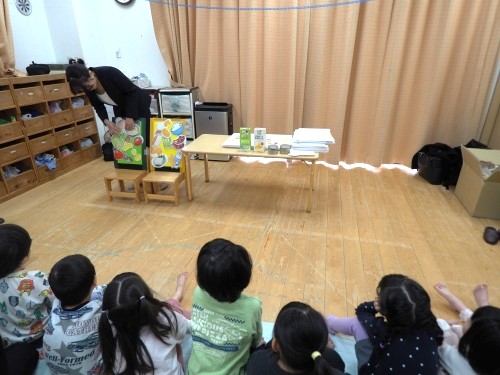 園では、園児の皆さんがすでに到着を待ちわびてくれていました。この日は、年長児にあたる「たいよう組」の11名が参加してくれました。
